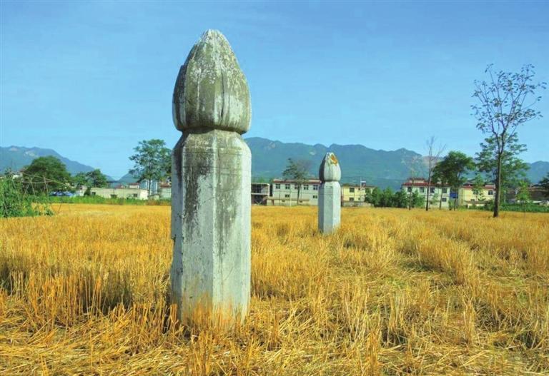 平闊的川地,村人已把一地莊稼收入自己殷實的谷倉,田野涂遍了陽光的顏色。遠遠地,我們就看見一座有兩尊八楞蓮苞頭華表矗立在田野之間,在另一塊地里,還有一個僅裸露肩膀于地表、頭顱已缺失的石翁仲,圓領(lǐng)官服、胸垂綬帶的文官裝束隱約可見……