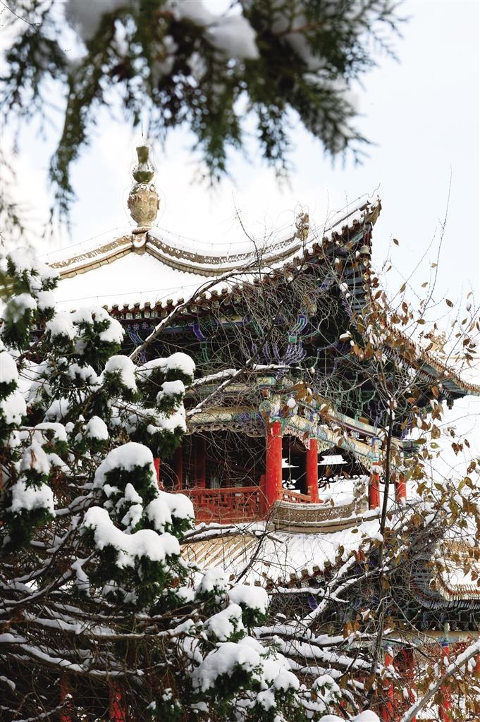 11月25日,雪后的蘭州五泉山公園銀裝素裹,迷人雪景如畫。古老亭臺樓閣紅墻玉頂、參天古樹玉樹瓊枝,宛如大地書寫的一幅“水墨丹青”,美不勝收,游客紛至沓來,賞雪、拍照,盡情享受清爽的空氣和潔白的美景。 奔流新聞·蘭州晨報記者 裴強 攝