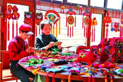 慶陽(yáng)香包非遺傳承人白淑方(右)在教授孫子繡制慶陽(yáng)香包。 盤(pán)小美攝