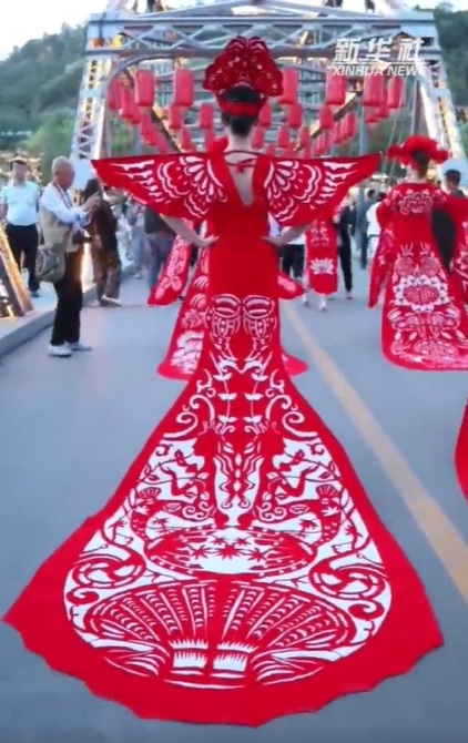 慶陽(yáng)剪紙?jiān)从谏?、講究情趣,是勞動(dòng)人民生產(chǎn)生活、情感氣質(zhì)、觀念習(xí)俗和文化傳承的結(jié)晶。著名民俗學(xué)家靳之林先生稱(chēng)剪紙藝人是“真正的藝術(shù)家”。1986年,中央美術(shù)學(xué)院邀請(qǐng)鎮(zhèn)原縣民間美術(shù)大師祁秀梅赴北京進(jìn)行民間美術(shù)教學(xué)交流,向大學(xué)生演示民間剪紙。法國(guó)、日本、澳大利亞等國(guó)家的藝術(shù)家也多次專(zhuān)程到隴東考察民間剪紙藝術(shù)。慶陽(yáng)剪紙已由鄉(xiāng)村婦女手中的小玩意,堂而皇之地步入了國(guó)家藝術(shù)殿堂——中國(guó)民間美術(shù)館,并在日、意、澳等國(guó)家展覽亮相。圖為身著慶陽(yáng)剪紙服裝的模特們行走在蘭州中山橋上,驚艷了來(lái)往的游客。