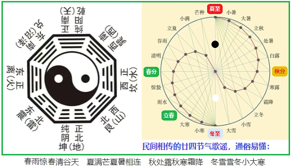 八卦是中華先民理性思維和高度智慧的結(jié)晶。華夏7000年前伏羲創(chuàng)制的八卦圖最初是用來(lái)分時(shí)紀(jì)年的,而在此基礎(chǔ)上發(fā)展起來(lái)的廿四節(jié)氣后來(lái)卻大放異彩。所謂“太極生兩儀,兩儀生四象,四象生八卦”的陰陽(yáng)變化,其實(shí)指的就是四季輪替,它代表了事務(wù)孕育、發(fā)展、成熟和衰亡的自然規(guī)律,告訴世人“變化,才是永恒不變的規(guī)律”這一本質(zhì)!如果在八卦圖上繼續(xù)往下切分,就能很自然地從八卦圖上得到廿四節(jié)氣(見(jiàn)圖)。