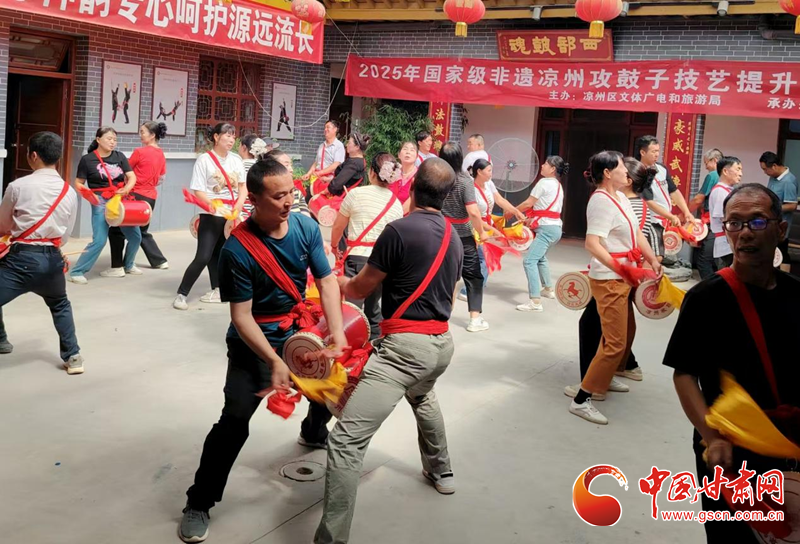 中國甘肅網(wǎng)7月19日訊(西北角·中國甘肅網(wǎng)記者 張振國 文/圖)為扎實推進(jìn)國家級非物質(zhì)文化遺產(chǎn)項目傳承與保護(hù),系統(tǒng)提升涼州攻鼓子團(tuán)隊專業(yè)水平,發(fā)展壯大攻鼓子傳承人隊伍。7月16日,由涼州區(qū)文體廣電和旅游局主辦、涼州區(qū)文化館承辦的2025年涼州攻鼓子傳承人技藝提升培訓(xùn)班分別在“涼州攻鼓子傳習(xí)所”和“四壩鎮(zhèn)非遺民俗文化館”開班。