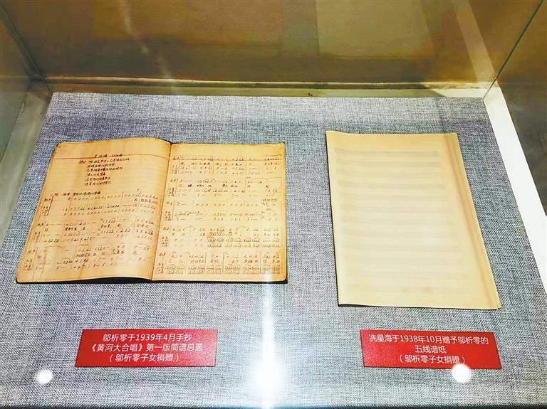 記者在《黃河大合唱》展覽館看到,展出的鄔析零1939年4月手抄《黃河大合唱》第一版簡(jiǎn)譜總譜,字跡小而工整,旁邊還陳展著幾頁五線譜紙,那是冼星海從巴黎帶回來,自己舍不得用,送給鄔析零的,而鄔析零也沒舍得用,就留存到了現(xiàn)在。這,都是歷史的見證。