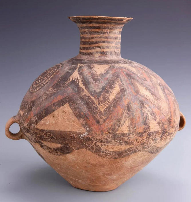 彩陶蛙紋壺,新石器時代馬家窯文化馬廠類型,高42厘米,口徑13.1厘米。壺泥質紅陶,口外侈,薄唇,球形腹,小平底,腹部兩側對稱置雙系。于橙紅色陶衣上以黑彩描繪變形蛙紋。圖案線條流暢,富于變化,與造型協(xié)調一致。據(jù)科學測試,馬家窯文化馬廠類型彩陶的年代約為公元前2200~前2000年。變形蛙紋作為馬家窯文化馬廠類型彩陶上常見的裝飾紋樣之一,體現(xiàn)了遠古人們對于繁衍生殖的渴望。青蛙產(chǎn)下許多卵,孵出許多蝌蚪,正是繁衍旺盛的象征。