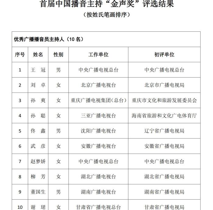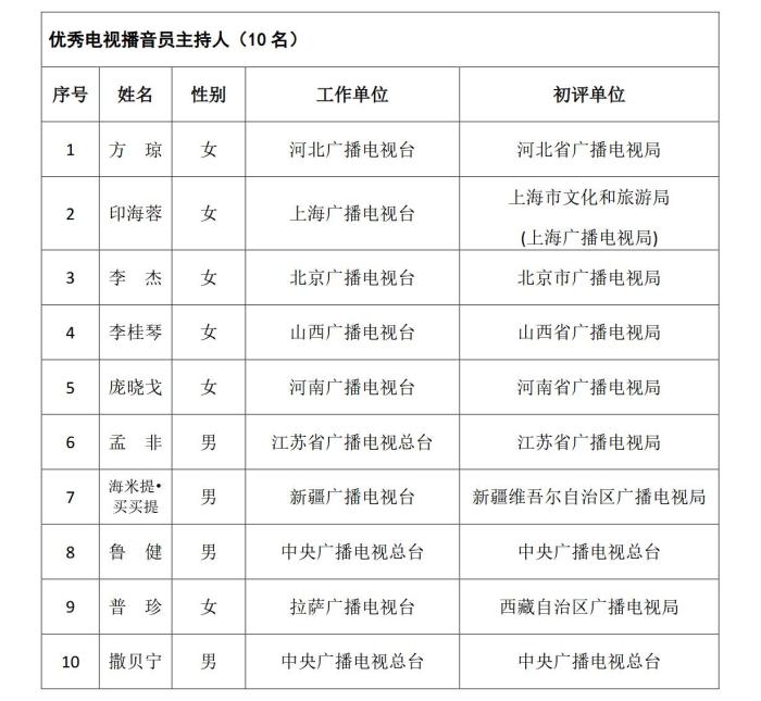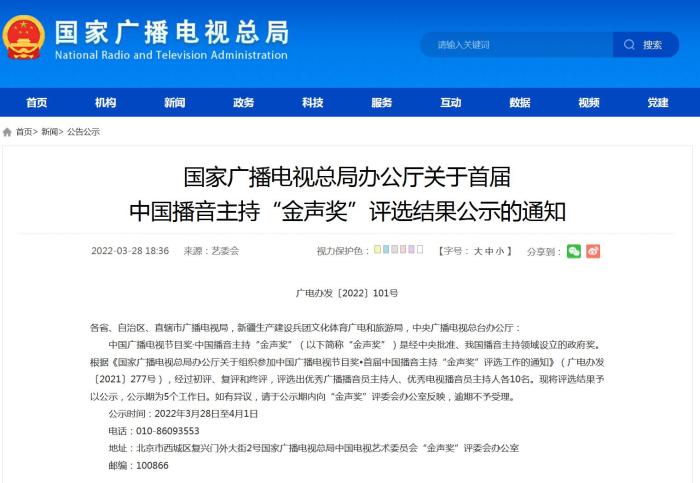 《通知》指出,根據(jù)《國家廣播電視總局辦公廳關(guān)于組織參加中國廣播電視節(jié)目獎•首屆中國播音主持“金聲獎”評選工作的通知》(廣電辦發(fā)〔2021〕277號),經(jīng)過初評、復(fù)評和終評,評選出優(yōu)秀廣播播音員主持人、優(yōu)秀電視播音員主持人各10名。現(xiàn)將評選結(jié)果予以公示,公示期為5個工作日。