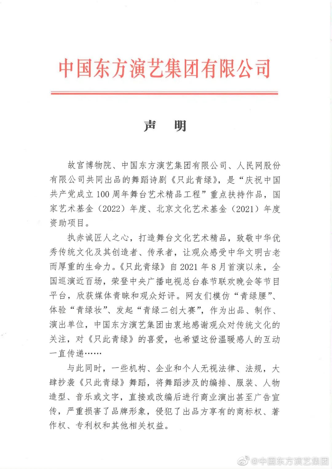 作為舞蹈詩劇《只此青綠》出品方之一,中國東方演藝集團(tuán)25日發(fā)表聲明,已啟動(dòng)對《只此青綠》的全面維權(quán)行動(dòng)。