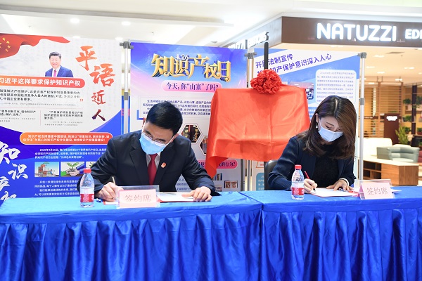 城關(guān)區(qū)法院與居然之家萬佳天水路店,就設(shè)立“知識(shí)產(chǎn)權(quán)司法保 護(hù)示范基地”及日常工作的詳細(xì)內(nèi)容簽訂備忘錄。記者 李洋 攝