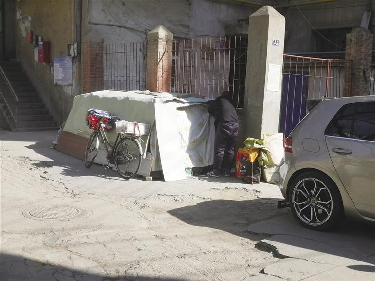 隨后,記者來到閔家橋59號,破舊的小區(qū)內堆積的雜物很多,有人堆積紙箱,有人干脆在小區(qū)院子內“圈地”堆放私人物品。“不知道人家在堆放什么,可是進門就能看見,很不雅觀。”居民李先生說,小區(qū)是老舊樓院,長期沒人管理,衛(wèi)生環(huán)境雖然不差,但是小區(qū)內堆積的東西太多。小區(qū)里有一個收廢品的,每天將回收來的紙箱堆積在單元樓門口,另一戶人家干脆“圈地”將自家的私人物品堆放在這里,用塑料布遮蓋起來,很不美觀。