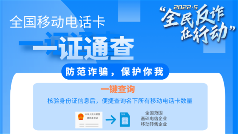 詐騙分子冒用他人身份開辦電話卡嚴(yán)重侵害用戶本人合法權(quán)益,廣大群眾對此深惡痛絕。“一證通查”服務(wù)打通了93家省級基礎(chǔ)電信企業(yè)和39家移動通信轉(zhuǎn)售企業(yè)相關(guān)數(shù)據(jù),群眾只需要使用自己的居民身份證,即可通過線上線下多種渠道查詢本人名下持有的全國移動電話卡數(shù)量,專用短信端口10699000將在48小時內(nèi)向預(yù)留手機(jī)號反饋結(jié)果,真正實現(xiàn)了全國移動電話卡的統(tǒng)一便捷查詢。