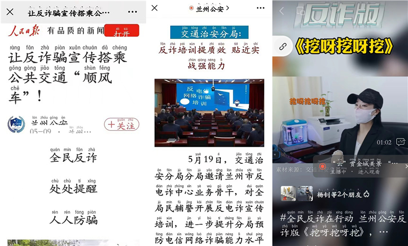 反電詐宣傳專班利用多媒體平臺(tái)錄制反電詐版“挖呀挖”,在各媒介平臺(tái)進(jìn)行了展播,廣大民輔警實(shí)時(shí)瀏覽并積極轉(zhuǎn)發(fā)。同時(shí),在中央及省市媒體廣泛刊發(fā)“五一”小長(zhǎng)假反詐宣傳不放假、讓反詐騙宣傳搭乘公共交通“順風(fēng)車”、全警參與、協(xié)同互動(dòng),讓蘭州市公安局交通治安分局防范電信網(wǎng)絡(luò)詐騙宣傳工作再發(fā)力。