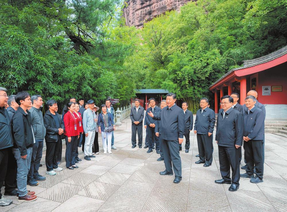 隨后,習(xí)近平來到麥積山石窟,沿著棧道仔細(xì)察看距今1600多年的洞窟和雕塑、壁畫,同保護(hù)修復(fù)工作人員親切交流。習(xí)近平說,我國四大石窟是中華文明的瑰寶,都具有重要的歷史價(jià)值、文化價(jià)值。他希望文物工作者賡續(xù)“莫高精神”,潛心為國護(hù)寶,為傳承創(chuàng)新中華優(yōu)秀傳統(tǒng)文化、增強(qiáng)中華文化影響力作出更大貢獻(xiàn)。
