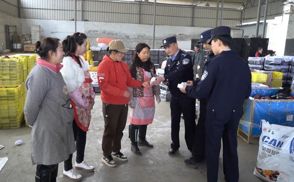 除了巡邏防控和矛盾調(diào)解,花牛派出所還開設(shè)了“田間課堂”,向果農(nóng)積極開展普法宣傳。在農(nóng)資市場休息區(qū),民警們拉起橫幅,向果農(nóng)們講解防盜、防騙、防火等安全知識。民警馬嘯不時翻看手機里的微信群說:“我們主動將果農(nóng)納入微信群,不定時推送防騙知識,果農(nóng)們遇到拿不準(zhǔn)的情況也會及時向我們咨詢。”