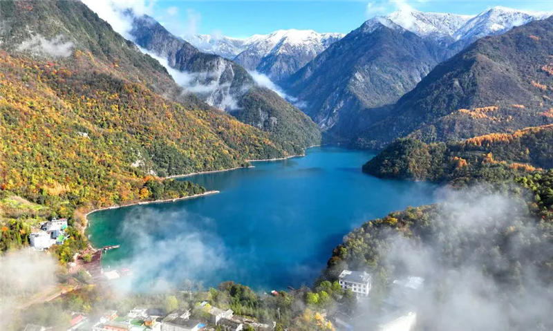 晨光初露,官鵝溝的薄霧尚未散盡,澤蕩湖面倒映著如黛青山。游客們紛紛舉起手機,將這幅山水畫卷定格,而一支巡邏警隊的藏藍身影,也悄然融進了這水天一色中。