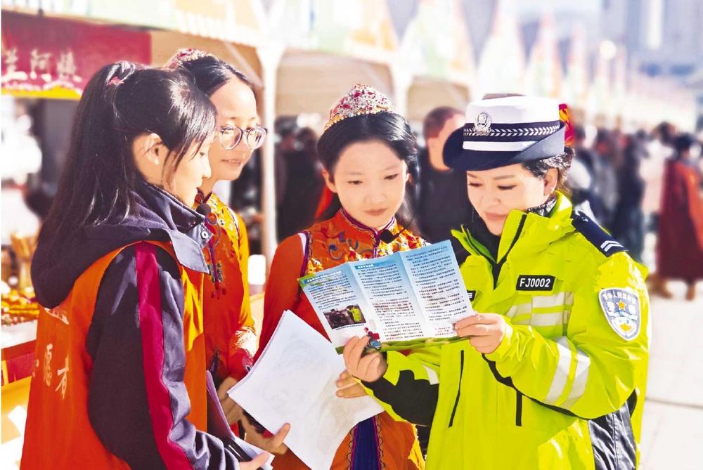 民警向群眾講解交通安全知識(shí)。11月27日,廣河縣公安局交管大隊(duì)民警走進(jìn)齊家文化廣場,利用戲曲進(jìn)鄉(xiāng)村文藝匯演的有利契機(jī)開展交通安全系列宣傳活動(dòng)。新甘肅·甘肅法治報(bào)通訊員 汪洋 攝