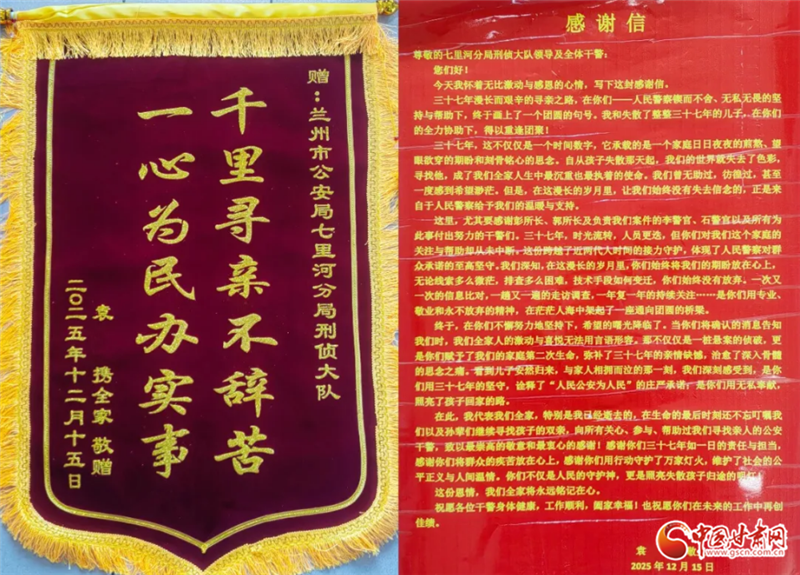 2025年12月15日,袁女士夫婦專程帶著兩面印有“千里尋親不辭苦 一心為民辦實(shí)事”的錦旗和飽含深情的感謝信,分別來到分局刑偵大隊(duì)、龔家灣派出所:“謝謝你們,幫我找回了失散半生的兒子,圓了我們?nèi)业膱F(tuán)圓夢(mèng)!”
