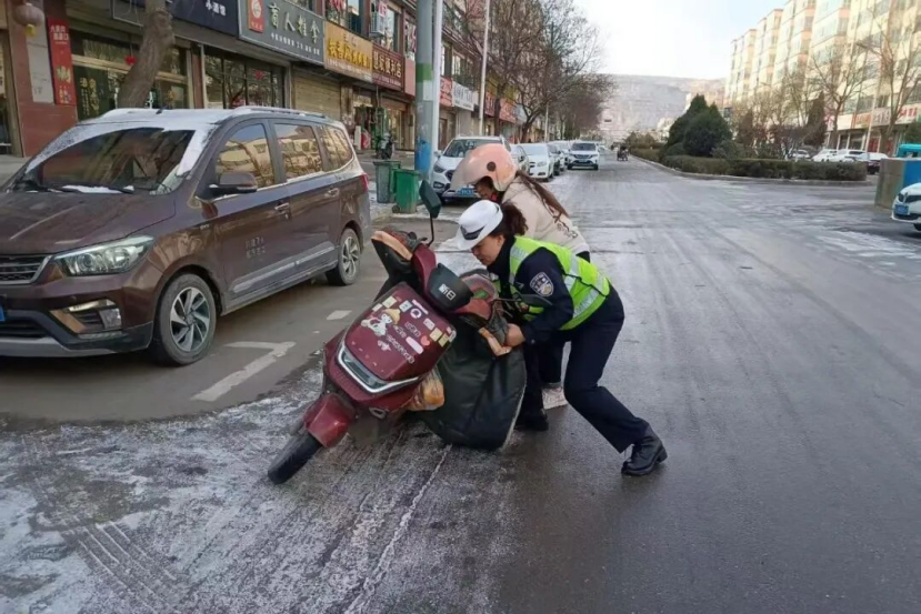 雨雪寒潮之中,定西公安交警始終堅守崗位,在疏堵保暢的同時,化身“暖心衛(wèi)士”,主動為受困群眾和車輛提供貼心救助。面對積雪路面車輛打滑、拋錨等突發(fā)情況,民輔警們不畏嚴寒,俯身推車、幫助安裝防滑鏈、排查車輛故障;針對出行不便的老人、學生等群體,主動攙扶護送,耐心解答指引、提供應急幫助。一幕幕暖心瞬間在雨雪街頭不斷上演,贏得過往群眾紛紛點贊。
