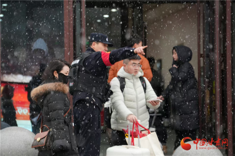 春運(yùn)期間,天水普降大雪,天水南站派出所民警加強(qiáng)警力部署,在站前廣場(chǎng)開展為民服務(wù)