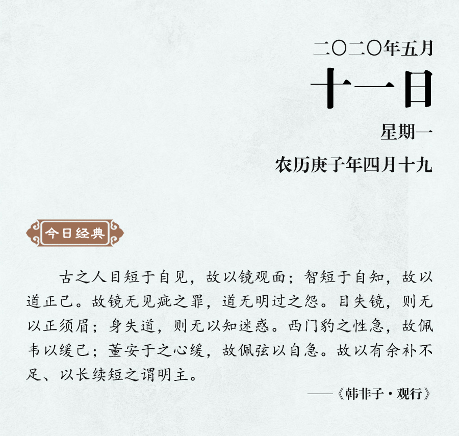 《老子》說:“知人者智,自知者明。”如果不能很好地認(rèn)識(shí)到自己的長(zhǎng)處和短處,就不能透徹地了解事物。韓非進(jìn)一步說:“目短于自見,故以鏡觀面;智短于自知,故以道正己。”無論是明君還是賢人,都要明確認(rèn)識(shí)到自身的不足,如此才能自知自見。“目失鏡則無以正須眉,身失道則無以知迷惑。”這既是說自見的局限,也是說自知的重要。韓非舉例說,魏國(guó)的西門豹因?yàn)樾愿窦痹辏耘宕魅彳浀钠硖嵝炎约?;董安于因?yàn)樾宰雍苈?,所以佩戴繃緊的弓弦來激勵(lì)自己,這兩位都是能夠自知不足的人。