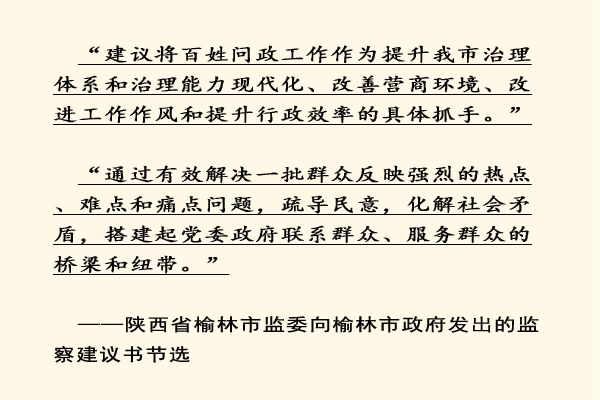榆林市紀(jì)委監(jiān)委相關(guān)負(fù)責(zé)人介紹,之所以將監(jiān)察建議書發(fā)給同級(jí)政府,主要是考慮到大多數(shù)問(wèn)題涉及單位多,需要市政府統(tǒng)一牽頭,明確權(quán)責(zé),多方協(xié)調(diào),最終高效快捷解決問(wèn)題。