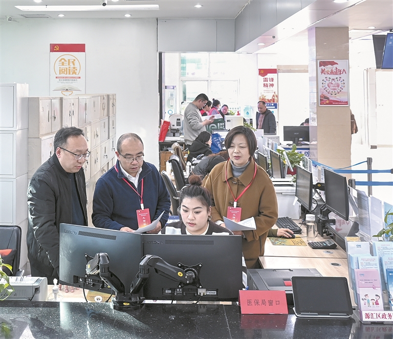 河南省漯河市源匯區(qū)紀(jì)委監(jiān)委聚焦醫(yī)?;鸢踩\行等關(guān)鍵環(huán)節(jié)開展專項整治,督促主管部門著力整治醫(yī)?;鸸芾碇刑搱竺邦I(lǐng)、騙取套取等違紀(jì)違法行為,嚴(yán)肅查處監(jiān)管失職失責(zé)及背后的不正之風(fēng)和腐敗問題。圖為近日,該區(qū)紀(jì)委監(jiān)委工作人員到區(qū)行政服務(wù)中心醫(yī)保局窗口走訪核實相關(guān)情況。尤亞輝 攝