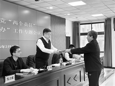 圖為河南省安陽(yáng)市紀(jì)委監(jiān)委向派駐市水利局紀(jì)檢監(jiān)察組遞交2025年度全面從嚴(yán)治黨監(jiān)督責(zé)任清單,持續(xù)推動(dòng)“兩個(gè)責(zé)任”走深走實(shí)。王小山 攝