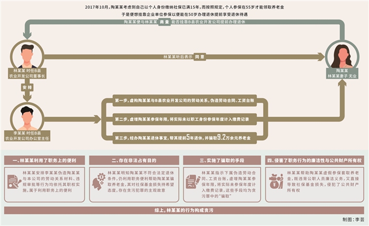 貪污罪。2017年10月,林某某妻子陶某某(無業(yè),另案處理)考慮到自己以個人身份繳納社保已滿15年,而按照規(guī)定,個人參保在55歲才能領(lǐng)取養(yǎng)老金,于是便想掛靠企業(yè)單位參保,以便能在50歲辦理退休、提前享受退休待遇?;诖耍漳衬潮闩c林某某商量能否掛靠B縣農(nóng)業(yè)開發(fā)公司提前辦理退休,林某某聽后表示同意,并利用擔(dān)任該公司董事長的職務(wù)便利,在明知陶某某不符合提前退休條件的情況下,安排時任公司辦公室主任李某某(另案處理)虛構(gòu)勞動關(guān)系,為陶某某以該公司職工身份辦理退休事宜。手續(xù)辦理過程中,李某某按林某某的安排,偽造B縣農(nóng)業(yè)開發(fā)公司與陶某某的《勞動合同書》,經(jīng)林某某本人簽字后加蓋公司合同專用章,陶某某憑該合同在B縣人力資源和社會保障局進(jìn)行勞動合同鑒證。完成鑒證后,陶某某順利以B縣農(nóng)業(yè)開發(fā)公司職工身份參保,當(dāng)年度公司為其繳納職工養(yǎng)老保險、工傷保險、失業(yè)保險、醫(yī)療保險共計7649.76元。其間,陶某某從未在B縣農(nóng)業(yè)開發(fā)公司上班,也未向公司補(bǔ)繳為其繳納的社保費(fèi)用。