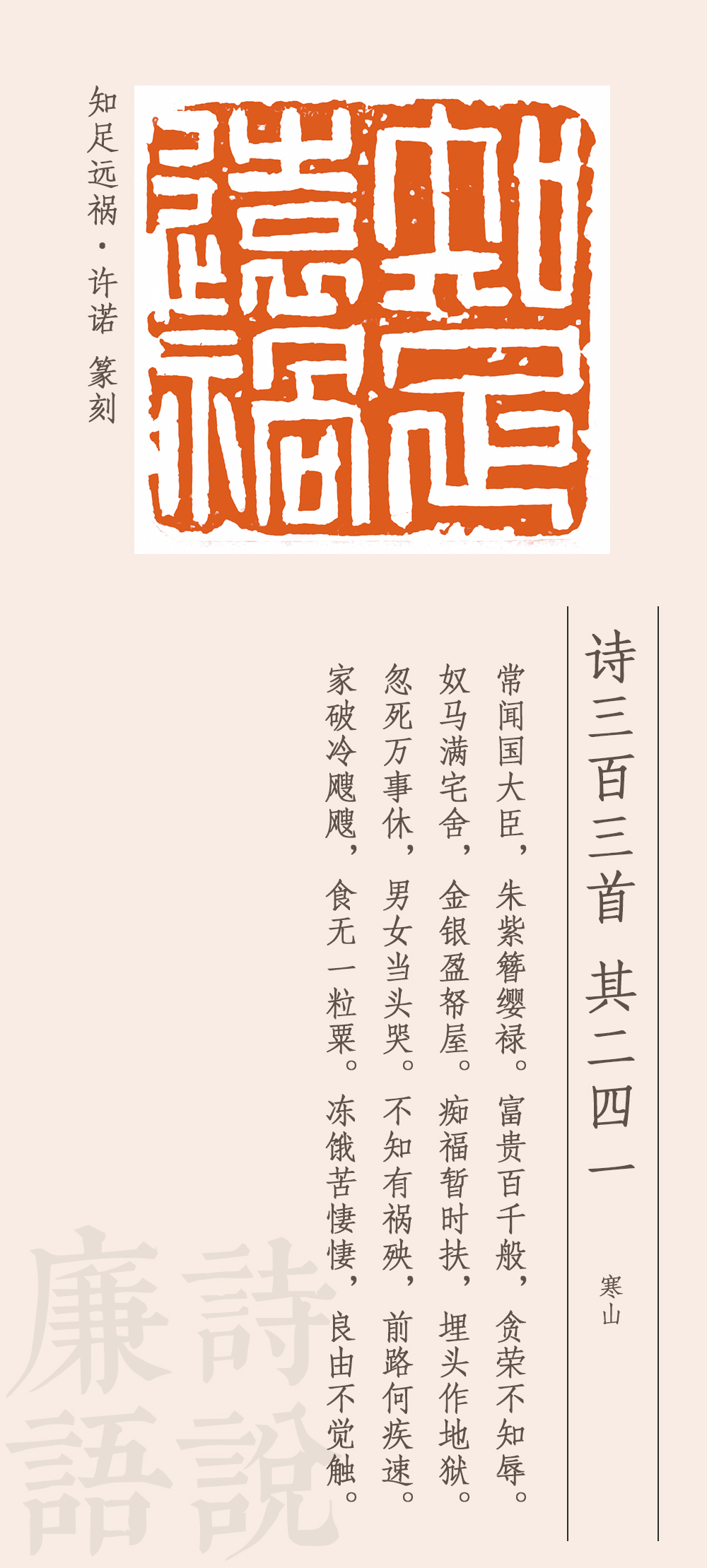 這首詩是諷刺高官貪圖富貴、聚斂財(cái)物的。他說,有些國(guó)之大臣,穿戴尊榮,好不威風(fēng),享受千般榮華富貴,卻一點(diǎn)兒都不顧及廉恥榮辱,家中擁有大量駿馬奴仆,屋子里堆滿金銀財(cái)寶,自以為這是在享福,其實(shí)是在給自己挖墳?zāi)沟鬲z。一旦死去,萬事皆休,富貴是無法永久保留的。如果因貪腐而遭受禍殃,那下場(chǎng)就會(huì)很慘。家破人亡,挨凍受餓,凄風(fēng)苦雨,苦不堪言。最后一句卒章顯志:之所以會(huì)有這樣的遭遇和結(jié)局,是因?yàn)闆]有悟透取禍的原因。這個(gè)原因從前面所述來看,就是太貪婪、不知足。