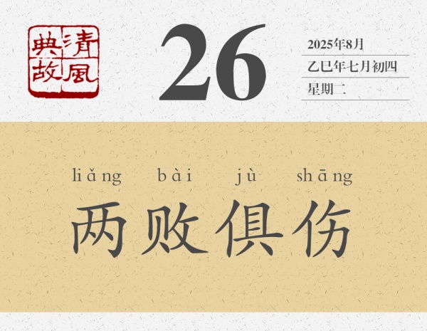 講完這個(gè)故事,陳軫言歸正傳,對秦惠王說:“今韓魏相攻,期年不解,是必大國傷,小國亡,從傷而伐之,一舉必有兩實(shí)。此猶莊子刺虎之類也。”秦惠王聽從了陳軫的建議,后來“大國果傷,小國亡,秦興兵而伐,大克之”。后世即以“兩敗俱傷”為典,比喻爭斗雙方都會(huì)受到損失,誰也得不到好處,也用來形容毫無意義的爭斗。《新五代史•宦者傳論》:“雖有圣智,不能與謀。謀之而不可為,為之而不可成。至其甚,則俱傷而兩敗。”