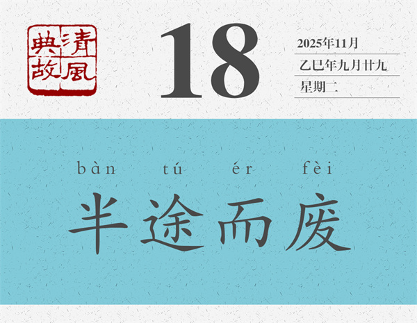 “半途而廢”語出《中庸》:“君子遵道而行,半途而廢,吾弗能已矣。”這句話是孔子說的:“君子遵循正道而行,但往往半途而廢,我絕不會停止的。”