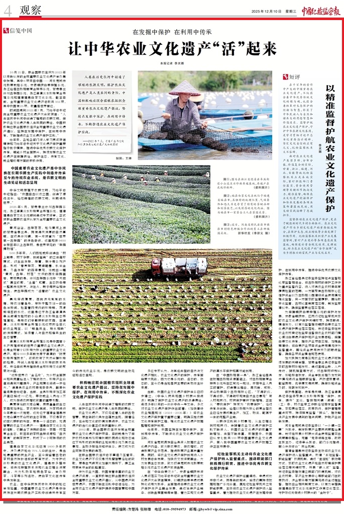 農(nóng)業(yè)文化遺產(chǎn)保護任重道遠。申遺成功并非終點,而是新的起點,后續(xù)仍需持續(xù)挖掘和推廣系統(tǒng)價值。屬地紀檢監(jiān)察機關立足職能職責,主動將農(nóng)業(yè)文化遺產(chǎn)保護納入監(jiān)督重點,著力推動農(nóng)業(yè)文化遺產(chǎn)在發(fā)掘中保護、在利用中傳承,推進中華優(yōu)秀農(nóng)耕文化保護傳承。