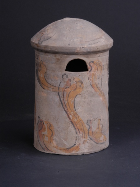 漢代,酒泉北稍門(mén)外出土。高19.4厘米,底徑11.6厘米。筒狀,球面頂,上部有一拱形倉(cāng)門(mén),筒身飾紅、黃、黑彩繪云氣紋。展現(xiàn)了當(dāng)時(shí)糧食豐收后的貯藏場(chǎng)景與人們對(duì)豐饒的祈愿。