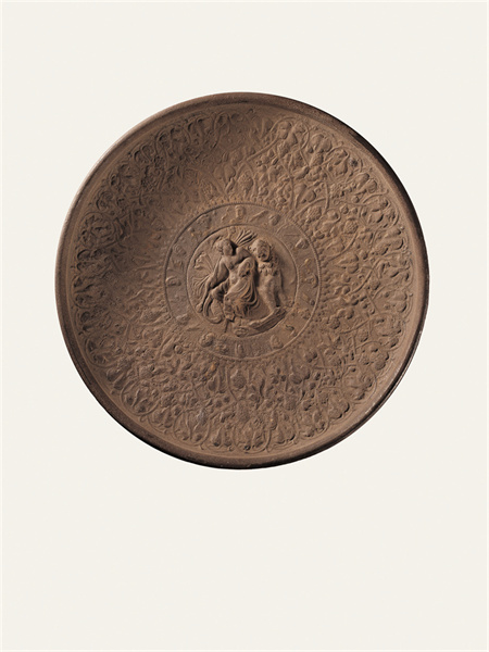 公元2-3世紀,靖遠縣征集,高4.6厘米,口徑31厘米,足徑10.9厘米。銀質(zhì)鎏金,以鑄造、錘鍱等工藝制成,鎏金已大部脫落。圓形,卷唇,斜孤壁,圈足。盤內(nèi)壁滿飾浮雕花紋,分3圈列置。外圈飾勾聯(lián)的葡萄卷草紋藤蔓,其間棲息30余只禽鳥等動物。中圈外緣飾細小聯(lián)珠紋,內(nèi)周環(huán)列12個頭像,頭像間為禽鳥等動物,或為希臘神話中的奧林匹斯山12神。中心為一高浮雕裸體男性,卷發(fā)無須,身披長巾,右手持圖爾索斯杖,杖首為松果狀飾物,為希臘神話中的酒神狄俄尼索斯。酒神倚一花豹而坐,鼻梁凸出,側(cè)首張口,頸下帶花環(huán),身上遍布圓斑。盤底圈足內(nèi)有一行刻作虛點的銘文,銘文年代晚于做器年代。此件器物發(fā)現(xiàn)于絲綢之路甘肅段的黃河渡口,是研究中西交流重要的實物資料,也是十分罕見的絲綢之路遺珍。