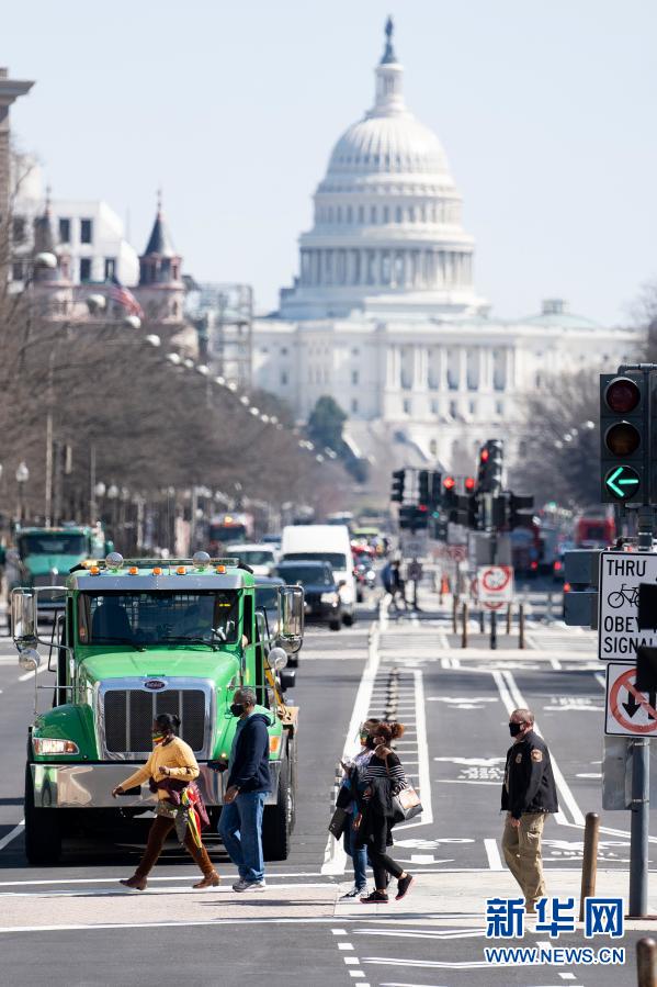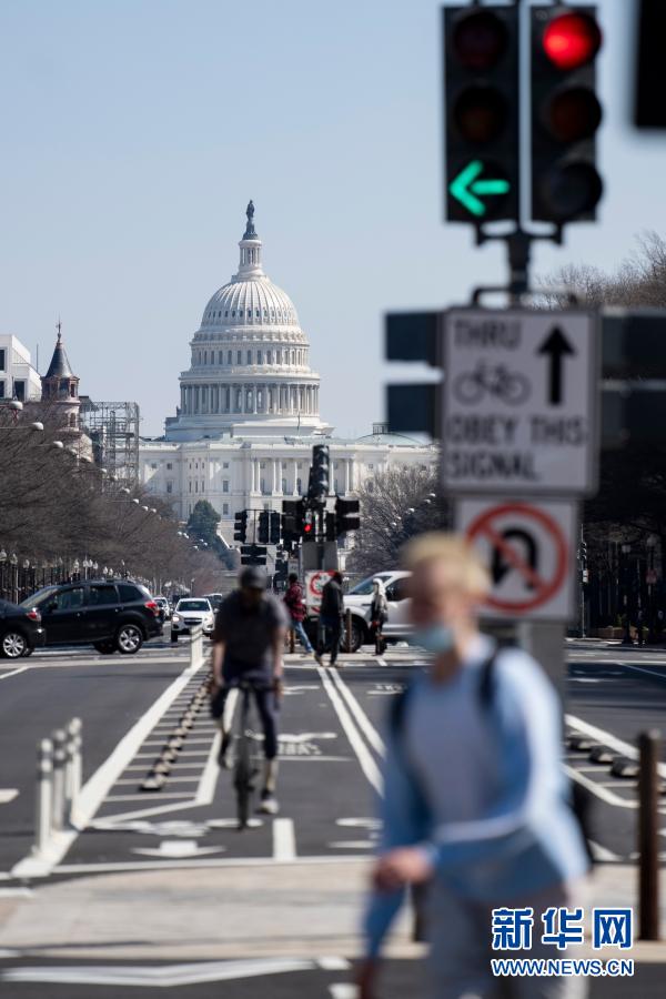 3月10日,在美國首都華盛頓,人們經(jīng)過國會大廈附近的一處路口。新華社記者劉杰攝