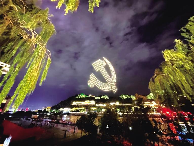 中國甘肅網(wǎng)7月1日訊 據(jù)蘭州日報報道(記者 王瀟旋 攝)為慶祝中國共產黨成立100周年,6月30日晚,深圳、合肥、鄭州、蘭州等地上演光影盛宴。蘭州用燈光和無人機扮靚城市夜空,為黨的生日獻上璀璨光影華美的祝福。
