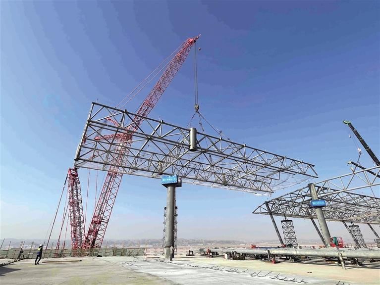 記者了解到,蘭州中川國際機場三期擴建工程新建航站樓共有A、B、C、D四條指廊,是航站樓重要組成部分,每條指廊長117米、寬90米,屋蓋投影面積20.45萬平方米,建筑面積39.73萬平方米。此次封頂?shù)臑楹秸緲荄指廊部分,由支撐體系和屋蓋鋼桁架結構組成,形成了一個不規(guī)則的自由曲面空間,總投影面積達到了29500平方米,總重量達2800多噸。根據(jù)總體計劃,蘭州中川國際機場三期航站樓工程鋼結構將于2022年底實現(xiàn)全面封頂。