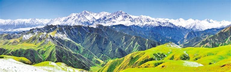 初秋的祁連山,碧空如洗,遠峰疊翠。山頂?shù)姆e雪在陽光照射下閃閃發(fā)光,陣陣清風拂過黃綠交錯的山林,驚起幾只飛鳥……
