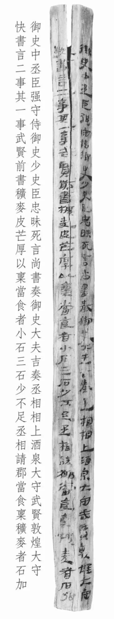 此簡為漢宣帝回復(fù)酒泉太守“辛武賢”和敦煌太守“快”奏疏的恩準(zhǔn)詔書,簡文記載的是皇帝詔書中對兩太守奏疏內(nèi)容的復(fù)述。從簡文內(nèi)容看,酒泉太守辛武賢和敦煌太守快給朝廷的奏疏主要涉及兩件事情:一是辛武賢認(rèn)為作為糧草的穬麥因皮厚芒長,如按規(guī)定每人發(fā)放小石三石,會造成實際數(shù)量的不足,所以他請求皇帝每石加發(fā)若干。另一件事顯然是敦煌太守快的上書,但文字未能容納于此簡,故不得而知。