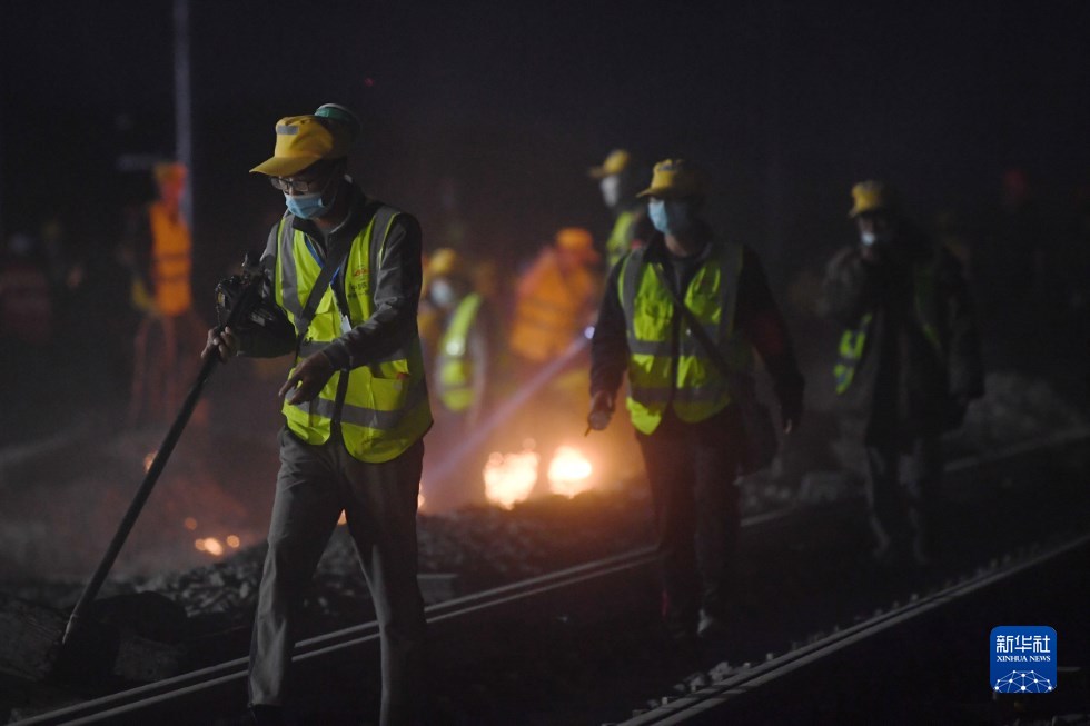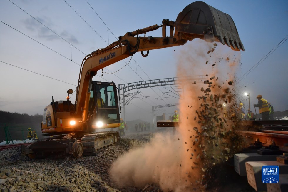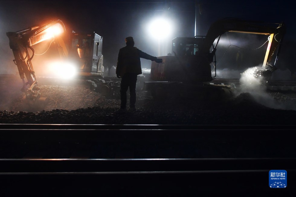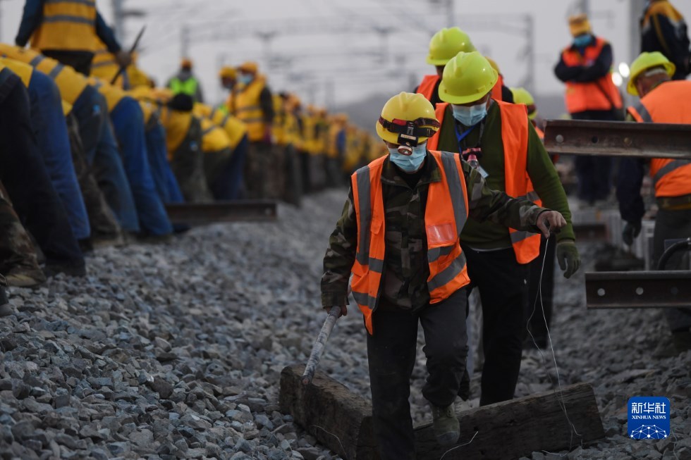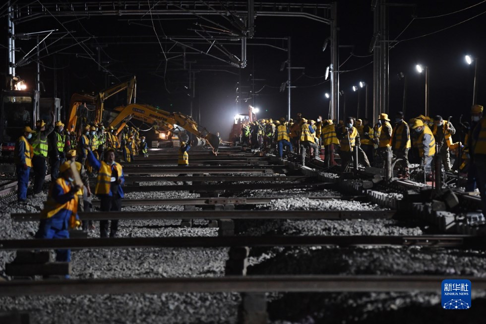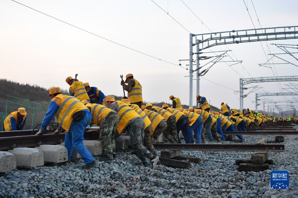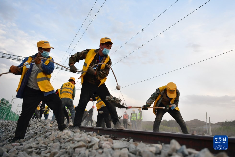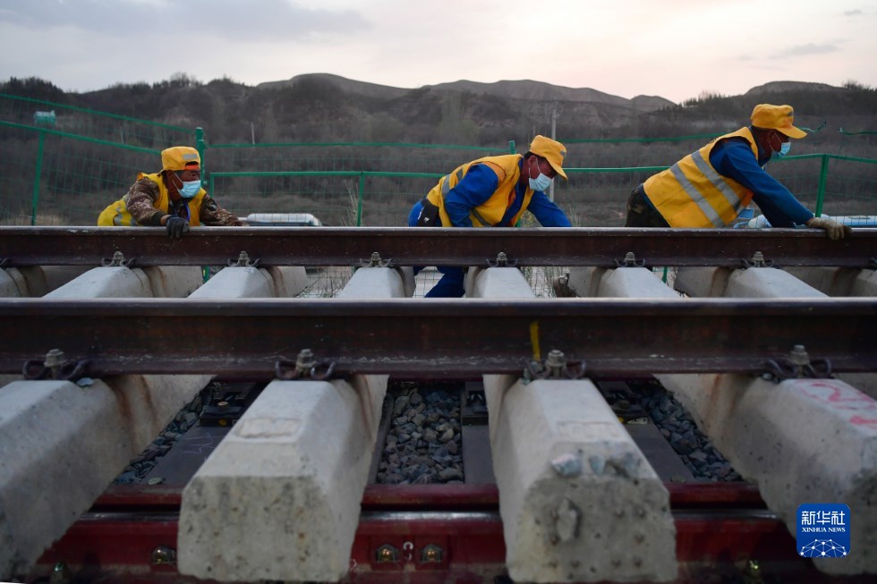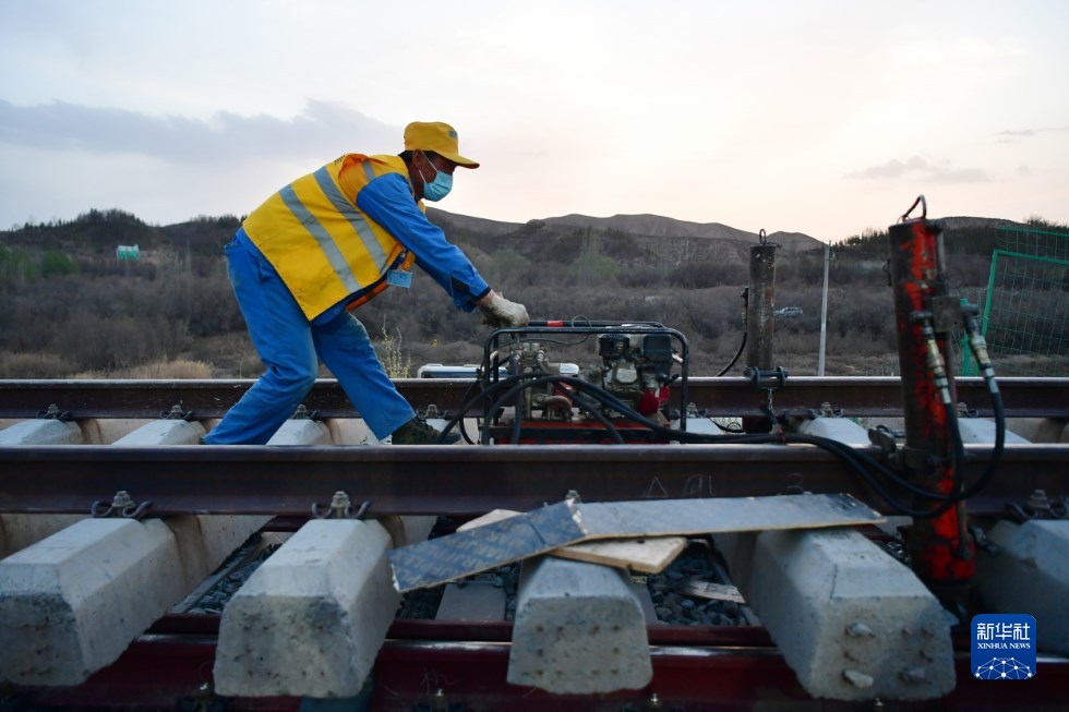 中鐵十一局建設(shè)者在中蘭客專(甘肅段)接入中川城際鐵路道岔插鋪施工現(xiàn)場(chǎng)作業(yè)(4月26日攝)。新華社記者 陳斌 攝
