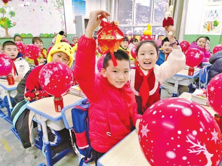 龔家灣第三小學(xué),孩子們展示裝有新學(xué)期目標(biāo)的福袋。