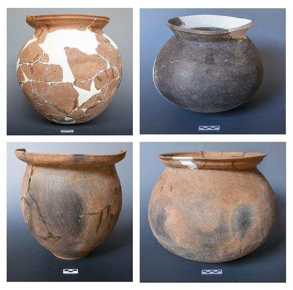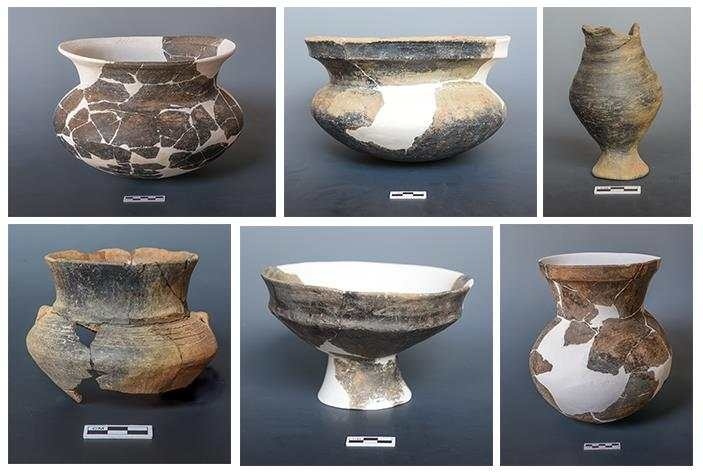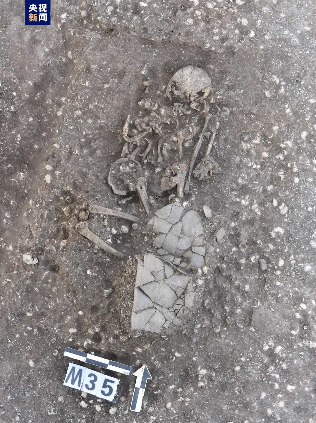 古城村遺址面積約4.2萬平方米,現(xiàn)存的貝丘堆積最厚處達(dá)6.5米,由大量尾部被敲破的螺螄殼與灰土層交替堆疊形成。碳十四測定年代為距今3600至2500年,約相當(dāng)于中原地區(qū)的商代至兩周時期。商代遺存可分為早晚兩段,早段發(fā)現(xiàn)保存完整的橢圓形環(huán)壕聚落,由中心臺地、外圍環(huán)壕和護坡組成,中心臺地面積約27000平方米,環(huán)壕和護坡周長約600米,這種聚落格局一直延續(xù)至兩周時期。商代晚段發(fā)現(xiàn)一批土坑墓和甕棺葬。兩周時期的遺存以房址、螺殼堆、灰燼、活動面等居住類遺跡為主,房址多為方形半地穴式。出土青銅器、陶器、玉器、石器、骨器、木器等文物4000余件。