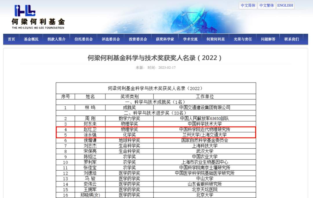 日前,何梁何利基金2021和2022年度頒獎(jiǎng)大會(huì)在北京舉行,共授予112名杰出科技工作者。其中,中國科學(xué)院近代物理研究所趙紅衛(wèi)、蘭州大學(xué)涂永強(qiáng)榮獲2022年度何梁何利基金科學(xué)與技術(shù)進(jìn)步獎(jiǎng)。