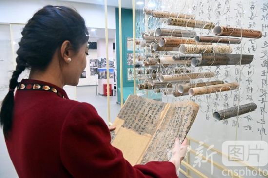 3月14日,敦煌研究院敦煌文獻研究所所長趙曉星接受中新社記者專訪介紹稱,全彩印《敦煌文獻全集》出版工作已正式啟動,該叢書采用全彩印的方式刊布敦煌文獻,實現(xiàn)敦煌文獻在線下圖錄中的高清還原。敦煌文獻,又稱敦煌遺書,是指1900年在甘肅敦煌莫高窟藏經(jīng)洞發(fā)現(xiàn)的公元4世紀至11世紀的寫本、印本和拓片等文獻。據(jù)最新統(tǒng)計顯示,其總數(shù)近7萬件。目前這些文獻分藏于中、英、法、俄、日等國的數(shù)十家收藏機構,一直缺乏完整的聯(lián)合目錄。圖為3月3日,工作人員在敦煌藝術館卷軸墻前閱覽敦煌遺書影印品。 中新社記者 九美旦增 攝