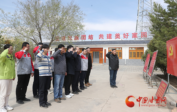 中國(guó)甘肅網(wǎng)和中鐵二十局市政公司黨員在八步沙紀(jì)念館莊嚴(yán)宣誓,重溫入黨誓詞。汲取“困難面前不低頭,敢把沙漠變綠洲”的八步沙精神力量。