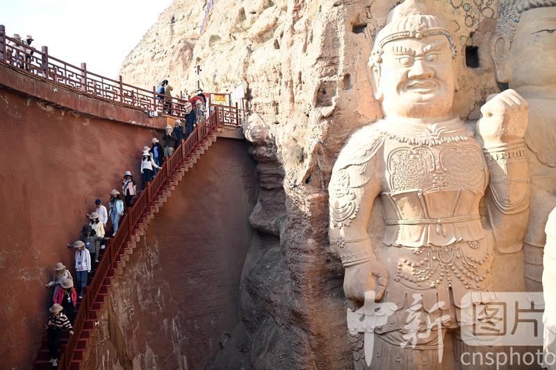 4月16日,甘肅省武威市涼州區(qū),學(xué)生在天梯山石窟參觀研學(xué)。