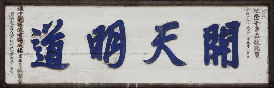該匾懸于天水伏羲廟大門前牌坊正中。長3.5米,寬1.25米,厚0.12米。素邊,匾心白底藍(lán)字,上下款朱書。此匾有雙上款和雙下款。第一個上款為“乾隆辛酉孟秋既望”,下款為“湟中觀察使者遼海楊應(yīng)琚薰沐敬書”;第二個上款為“嘉慶十二年歲次丁卯五月吉旦”,下款為“中憲大夫?qū)幭母蜓a(bǔ)知秦州事王公重建”。