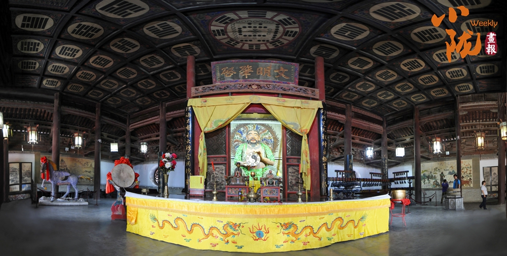 先天殿莊嚴肅穆,殿內正中便是高達3米的人文始祖伏羲坐身塑像,樹葉披身,手持八卦盤,氣宇軒昂,雙目炯炯凝視前方,神龕上方懸掛著清嘉慶時州牧王賜均書“文明肇啟”巨匾,仰頭上望,頂上繪有河圖洛書、六十四卦,令人肅然起敬。