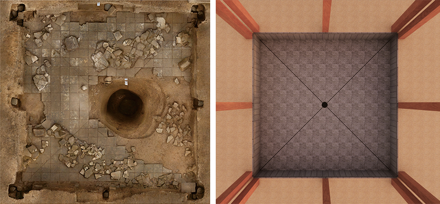 中部夯土臺(tái)基的中心發(fā)現(xiàn)一處神秘的半地穴空間。它的地面鋪素磚,四壁貼壁磚并用鐵釘固定,各磚縫之間還用特殊材料專門(mén)做了“美縫”處理。種種跡象表明此處可能是一個(gè)“水池”,但中間被一口豎井狀大坑破壞。