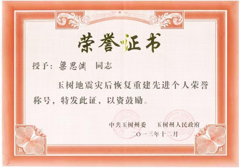 他一直這樣嚴(yán)于要求自己。因在格薩爾王賓館地震遺址維修保護項目中作出突出貢獻(xiàn),梁思淵被玉樹州委、州政府評為“玉樹地震災(zāi)后恢復(fù)重建先進(jìn)個人”。疫情期間,他主動請纓,參與雁南路街道防疫物資運輸保障任務(wù),轉(zhuǎn)運物資總計150多趟次。