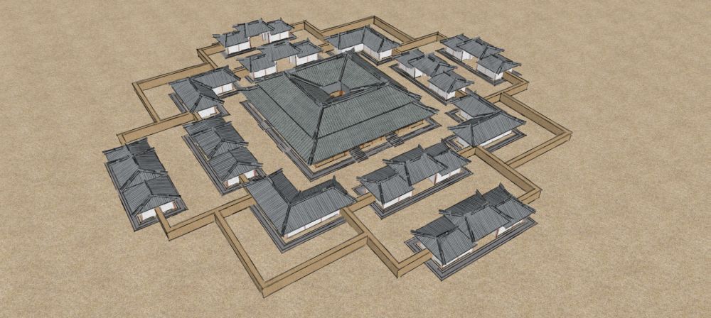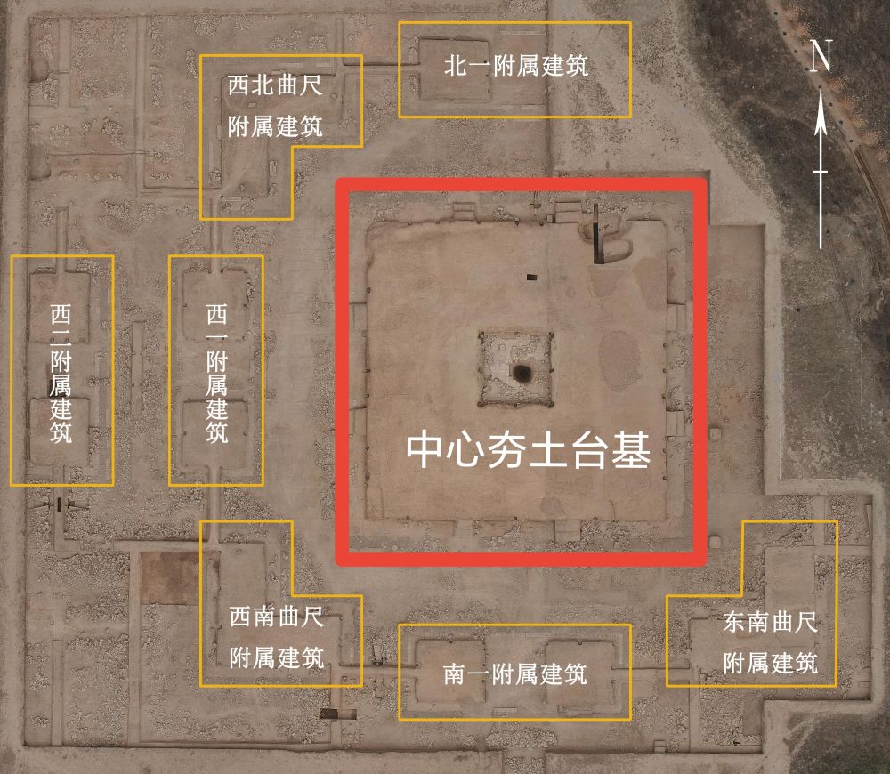 遺址結(jié)構(gòu)清晰——以中心夯土臺基為中心,東西南北各有兩組并行對稱的長方形附屬建筑,四角分布曲尺形附屬建筑。殘留建筑遺跡面積近9000平方米。