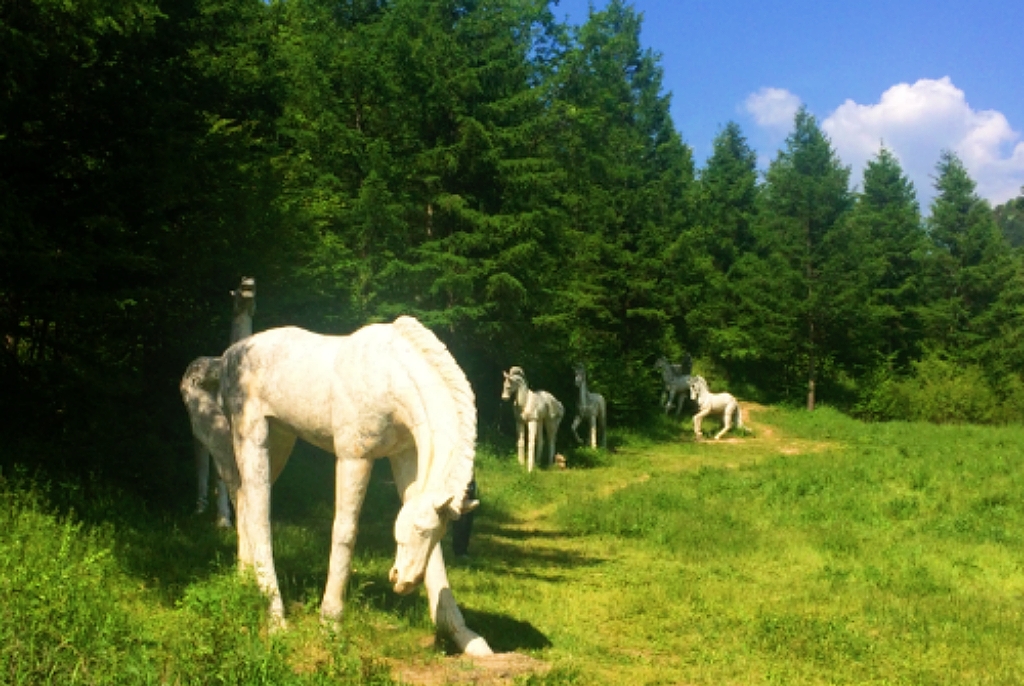在碧草連天的谷地,當(dāng)?shù)芈糜尾块T(mén)擺放了一組白馬的大型雕塑,栩栩如生,它們要么仰天長(zhǎng)嘶,要么低首撫弄地上的青草,還有的彼此耳鬢廝磨,像是親密的戀人。